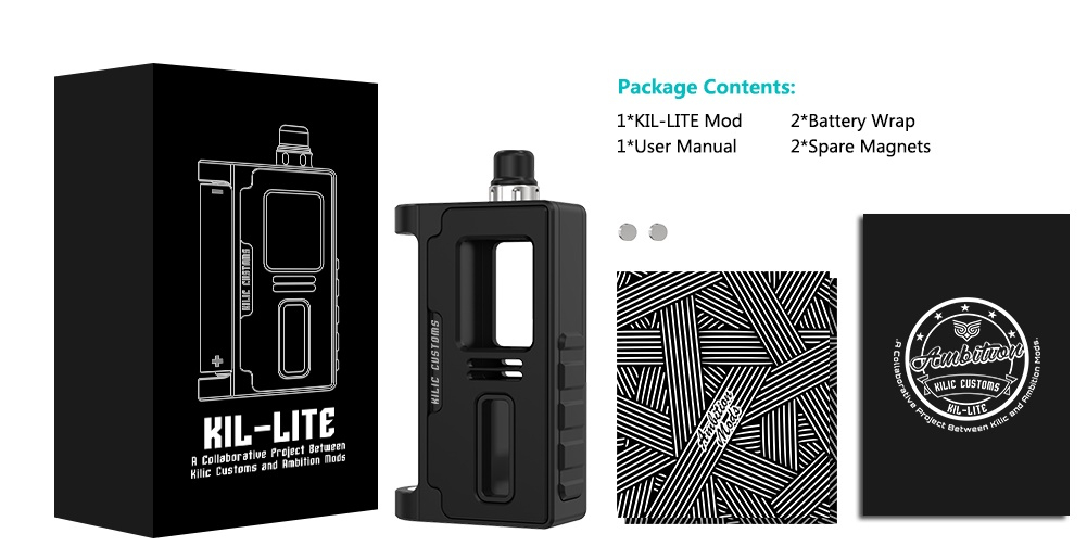 Ambition Mods hat in Zusammenarbeit mit Kilic Customs aus Malaysia die Kil-Lite AIO 60W auf den Markt gebracht. Die Ambition Mods Kil-Lite AIO 60W ist ein Akkuträger für Boro Tanks und Boro RBA Tanks, dadurch lassen sich eine Vielzahl von Verdampfern nutzen. Um den Akkuträger in betrieb nehmen zu können, muss erst mal ein 18650 Akku (nicht inbegriffen) von hinten eingeschoben und dann über die Fixierung von oben her fixiert werden. Da man bei diesem Prinzip den Akku jeweils sehen kann, legt Ambition Mods dem Kil-Lite Akkuträger noch passende Battery Wraps bei. Als Chip kommen beim Kil-Lite zwei verschiedene Versionen zum Einsatz: der proprietäre Chip von Ambition Mods oder der DNA60 von Evolv. In beiden Fällen liefert der Akkuträger eine Leistung von bis zu 60W im Watt Modus und unterstützt auch Temperaturkontrolle (Ni, Ti, SS).