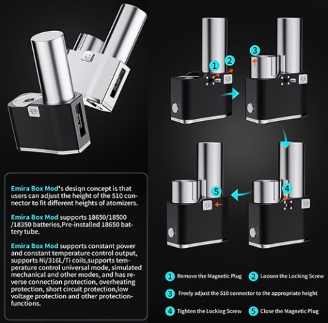 Ambition Mods hat in Zusammenarbeit mit dem italienischen Modder Telli's Mods einen neuen Side-by-Side Akkuträger auf den Markt gebracht, den Emira Mod. Der Ambition Mods Emira Mod glänzt dabei mit einigen Features, die man so zuvor eher selten sah. Das wohl auffälligste Merkmal des Emira SbS Mods ist der höhenverstellbare 510er Anschluss. Dadurch lässt sich die Position des Tankes in der Höhe zu einem gewissen Grad einstellen (z.B. damit der Tank bündig mit der Akkuhülse abschliesst). Um dies bewerkstelligen zu können, hat der Hersteller an der Seite eine kleine Schraube angebracht, welche durch eine magnetische Abdeckung mit dem Logo von Telli's Mods versteckt wird.