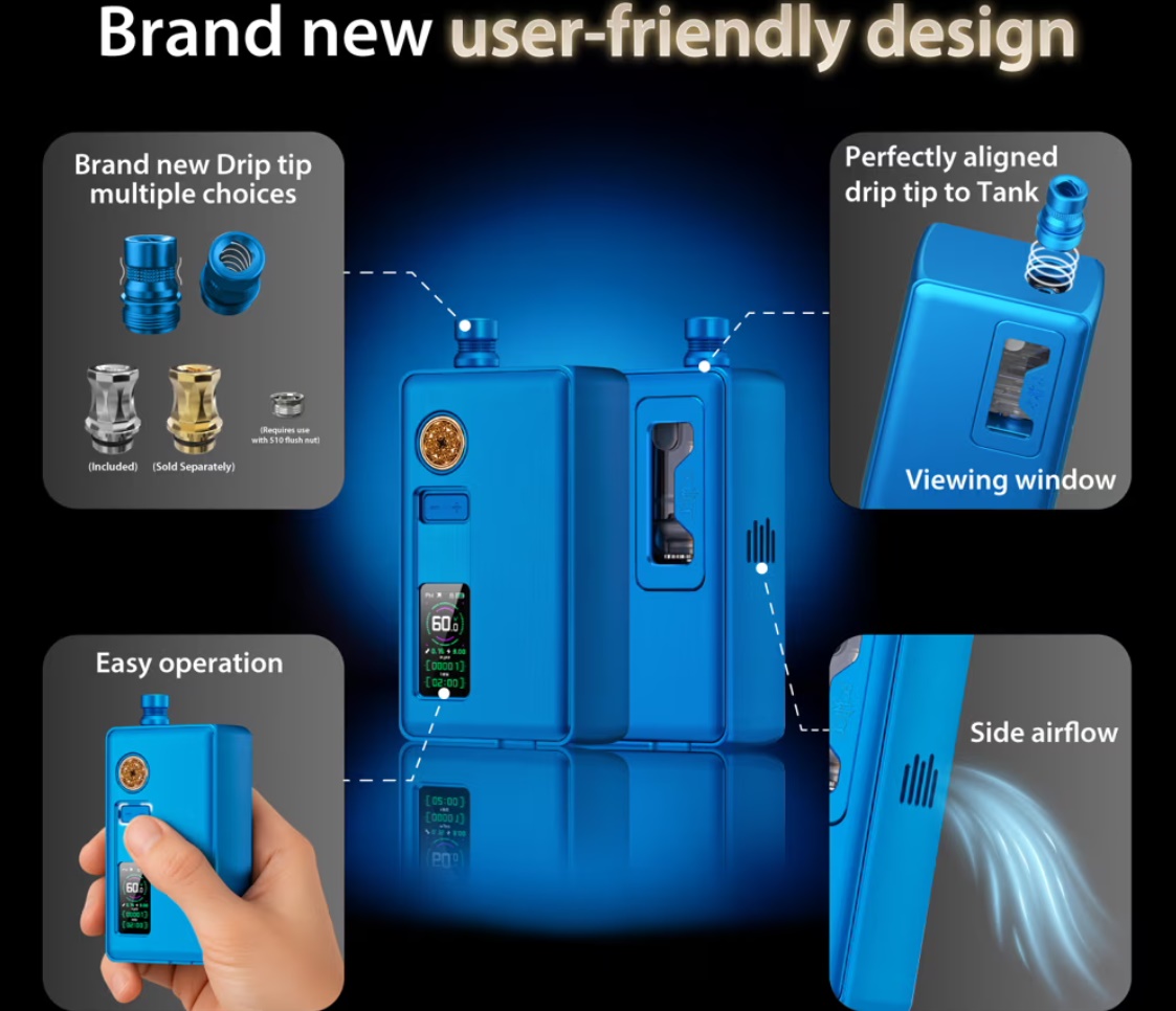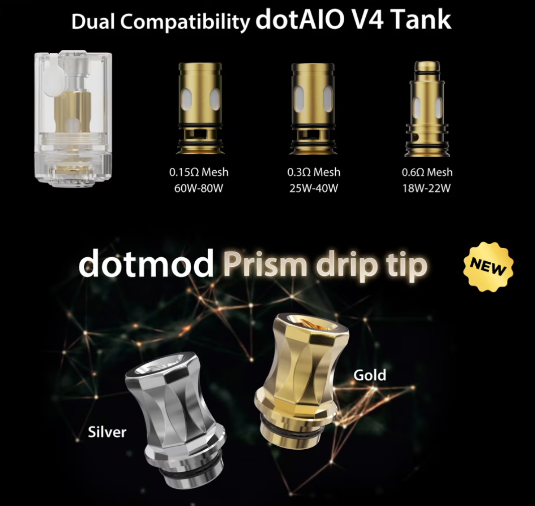 Als Tank kommt bei der DotMod DotAIO V3 der neue Dot Tank V4 zum Einsatz. Darin können weiterhin die dotCoils (DotAIO V2/V2 Lite Coils, nicht die DotAIO V1 Coils) genutzt werden. Eine Neuerung bei der DotAIO V3 ist der interne Kontakt. Wie schon bei der DotApollo kommt auch bei der DotAIO V3 ein neues Kontaktsystem zum Einsatz, ähnlich wie bei Boro AIOs. Entsprechend liegen dem Set auch ein neues Integral Drip Tip und eine Flush Nut (für 510er Drip Tips) bei. Durch den modularen Aufbau erlaubt die DotAIO V3 ein vielseitiges Customizing.