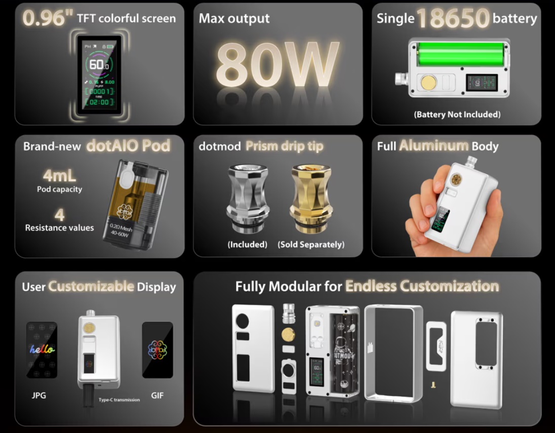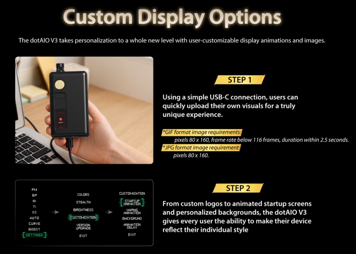 Die DotMod DotAIO V3 ist die jüngste Version der allseits beliebten DotAIO und bietet einige Neuerungen im Vergleich zu den Vorgängern. Die DotAIO V3 ist ausgelegt für die Nutzung eines 18650 Akkus (nicht inbegriffen), damit lassen sich im Power Modus bis zu 80W abrufen. In der DotAIO V3 kommt die neuste Version des hauseigenen Chips zum Einsatz, welcher nebst den bekannten Modi Auto, Power, Bypass, TC (Ni, SS, Ti), Curve und Boost nun auch die Möglichkeit bietet, um das Hintergrundbild und die Animation einfach anzupassen. An der Seite des Mods befindet sich das 0,96" TFT Farbdisplay, welches den Nutzer über die gewählten Einstellungen informiert. Das seitliche Panel verfügt zudem über Ausschnitte im Bereich des Displays und der Tasten für Plus/Minus, so dass man Änderungen auch ohne vorheriges abnehmen des Seitenteils vornehmen kann.