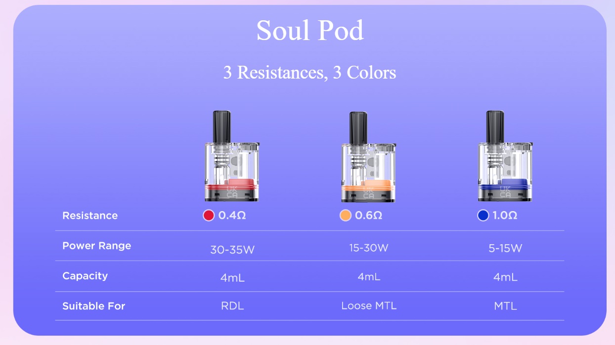 Die Geekvape Soul Pods werden in 3 verschiedenen Versionen angeboten. Während sich der 0,4 Ohm Pod eher für RDL mit bis zu 35W eignet, so ist der 0,6 Ohm Pod mehr für offenes MTL geeignet und der 1,0 Ohm Pod für MTL. Der Pod fasst jeweils 4ml Liquid und ist dank der seitlichen Füllöffnung einfach zu befüllen. Geliefert werden die Pods zu 2 Stück pro Packung.