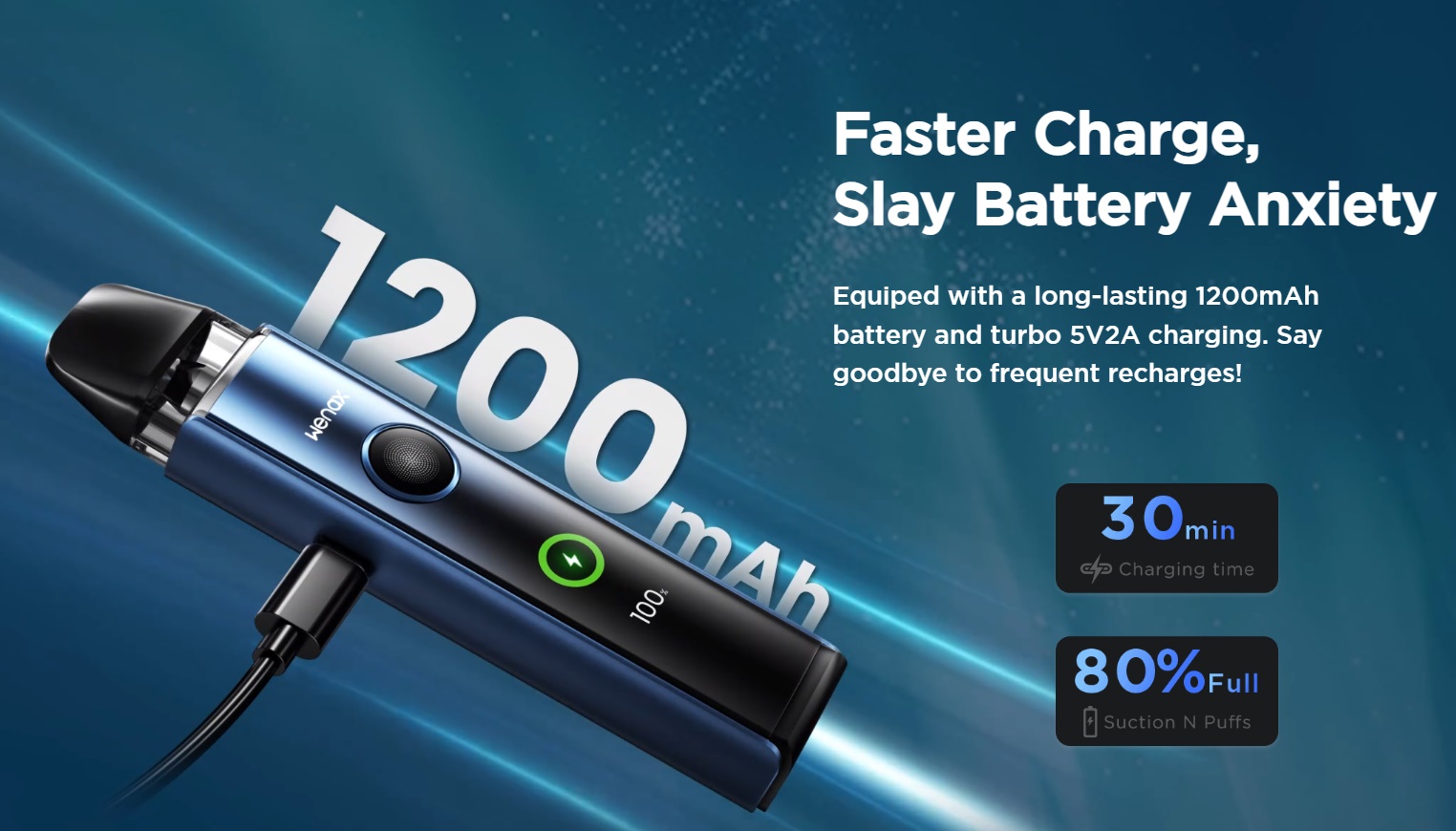 Ein weiteres Features des Geekvape Wenax Q Pro ist die Touch-Bedienung der Plus/Minus Tasten unterhalb des 0,96" grossen Farbdisplays. Seitlich am Gerät befindet sich ein Schieberegler, über welchen man den Zugwiderstand ganz nach dem eigenen Geschmack einstellen kann. Über den USB Type-C Anschluss lässt sich der 1200mAh grosse Akku mit bis zu 2A zügig wieder aufladen.