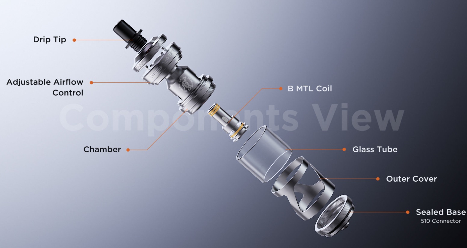 - Masse: 26,8mm Durchmesser, 60,99mm Höhe (mit Drip Tip)