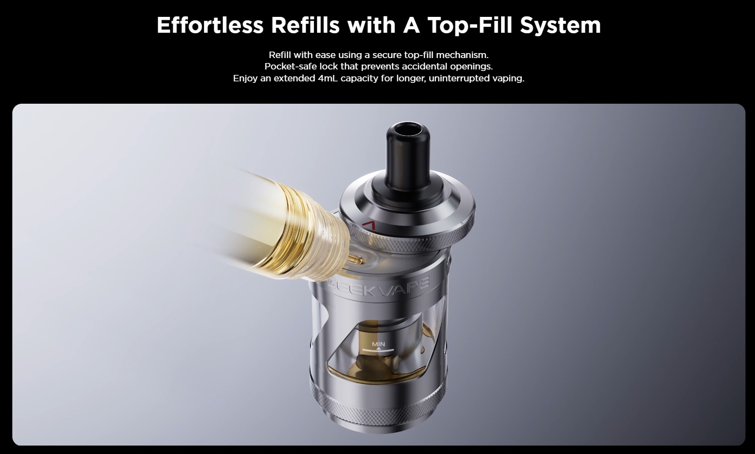 Der Geekvape Z Nano MTL ist ein MTL Verdampfer für die Verqwendung der beliebten Boost Coils (Achtung, es passen nur die neuen B-Coils rein). Mit dem Z Nano MTL bringt Geekvape auch gleich zwei neue B-Coils, welche für den reinen MTL Einsatz gedacht sind: der B-Coil 0,8 Ohm MTL(12-16W) und der B-Coil 1,2 Ohm MTL (8-12W). Der Geekvape Z Nano MTL hat ein Füllvolumen von 4ml und lässt sich dank des Top Filling mit Schiebeverschluss einfach und bequem befüllen. Mit seinen 26,8mm Durchmesser an der breitesten Stelle, lässt sich der Z Nano MTL Tank auf einer Vielzahl von Akkuträgern nutzen.