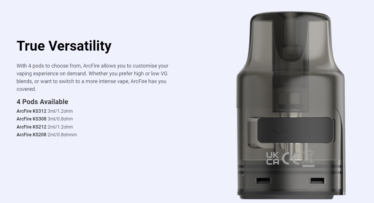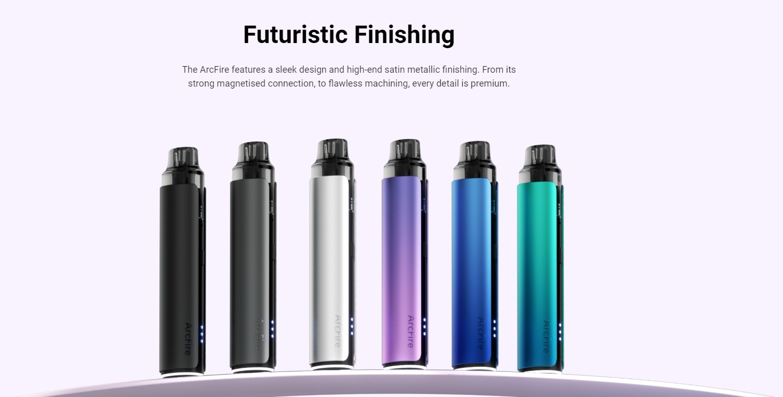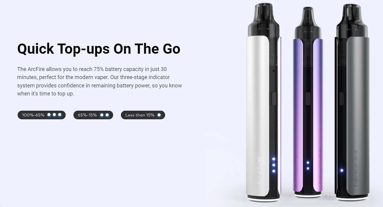An der Frontseite und am Boden befinden sich jeweils LED Indikatoren, welche über den aktuellen Lade- und Akkustand informieren. Mit seinem schlichten Aufbau und der einfachen Handhabung eignet sich der Innokin ArcFire ideal für Umsteiger, die ein einfach zu bedienendes Podsystem suchen.