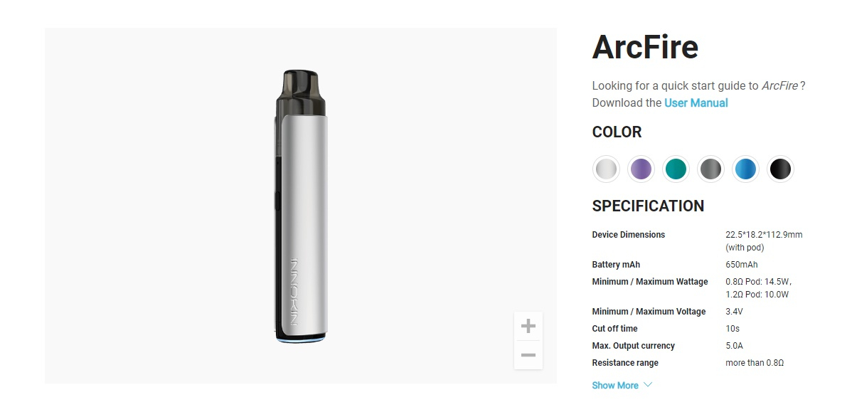 Das Innokin ArcFire Pod Kit richtet sich ganz klar an Einsteiger und solche Dampfer, welche es gerne einfach haben. Das kompakte Podsystem wird mit einem 1,2 Ohm Pod mit 3ml Füllvolumen (TPD Version 2ml) geliefert, wobei sich der Pod dank des grosszügigen seitlichen Füllloches einfach befüllen lässt. Der Akku des ArcFire Pods misst 650mAh und wird über den USB Type-C Anschluss geladen. Im Gegensatz zu einigen anderen Podsystemen dient der Taster am Innokin ArcFire nur zum ein- und ausschalten, jedoch nicht als Feuertaster. Denn der ArcFire besitzt nur eine Zugautomatik.