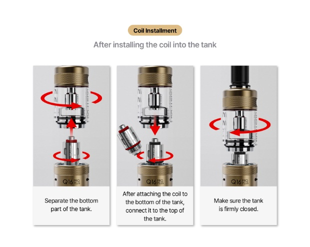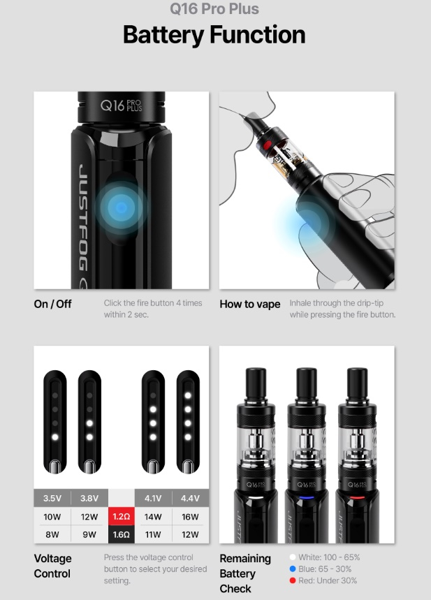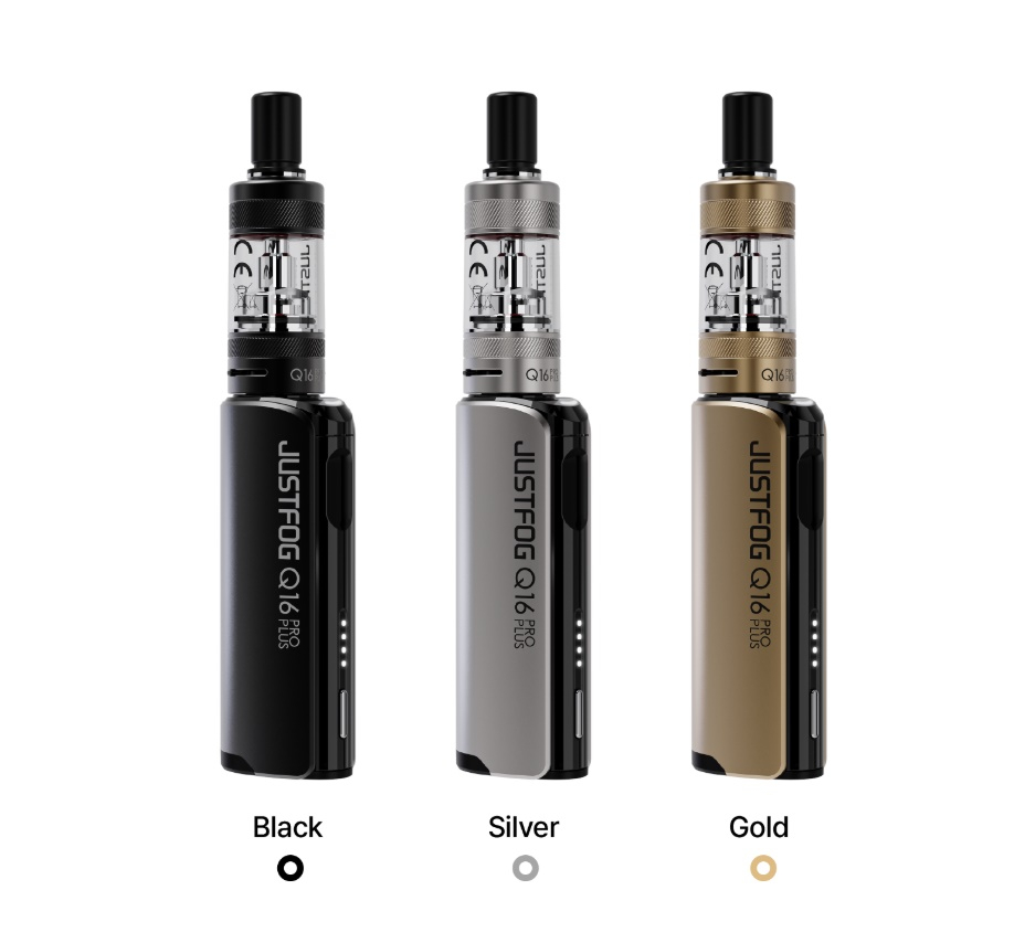 Neu am Tank des Q16 Pro Plus ist auch sein Füllvolumen. Hatten die Vorgänger noch jeweils knapp 2ml an Tankkapazität, so hat Justfog diese beim Q16 Pro Plus auf 3ml erweitert. Als Coils kommen beim Justfog Q16 Pro Plus die bewährten Q16 1,2 Ohm und 1,6 Ohm Coils zum Einsatz. Der Q16 Pro Plus bietet 4 Leistungsstufen, die über den Taster einstellbar sind. Damit lässt sich die Spannung von 3,5V bis 4,4V einstellen. An der Oberseite des Akkuträgers befindet sich der LED Indikator, welcher gut ersichtlich über den Akkuzustand informiert.