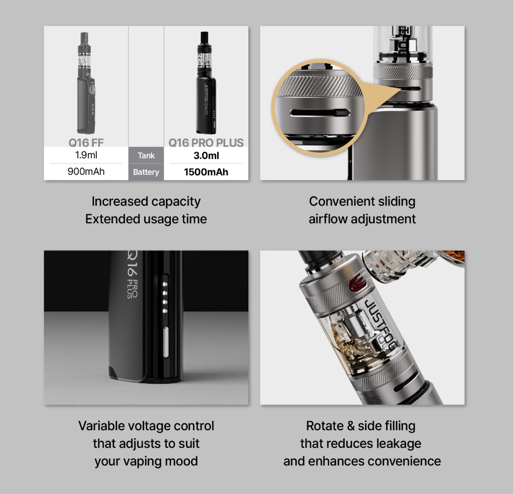 Der neue Justfog Q16 Pro Plus ist die logische Erweiterung der beliebten Q16-Reihe. Der Q16 Pro Plus besitzt einen grösseren Akku mit 1500mAh und kann neu über den USB Type-C Anschluss an der Unterseite geladen werden (nicht für Quick Charge vom Handy geeignet). Während der Akkuträger von der Höhe her nicht viel höher ist als sein Vorgänger, so hat er in der Breite und Tiefe leicht zugelegt. Der Tank des Justfog Q16 Pro Plus erinnert an den Q16 FF, hat er von diesem das Befüllsystem übernommen. Statt das Top Cap abschrauben zu müssen wie beim alten Q16 Pro, muss man das Top nur um 1/4 Umdrehung drehen und schon kommt die Füllöffnung zum Vorschein.