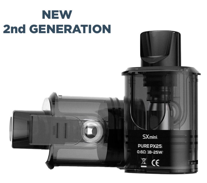 Die SxMini PureMax Pods sind in 3 verschiedenen Widerständen erhältlich. Während sich der PX25 0,6 Ohm eher für DL eignet, kann der PX20 0,8 Ohm sowohl für RDL oder MTL genutzt werden. Der PX12 1,2 Ohm wiederum eignet sich für MTL und Low Power. Die Packung enthält jeweils 2 Pods. Bei diesen Pods handelt es sich um die 2nd Generation Pods, welche über die neue Füllöffnung mit dem Schiebeverschluss verfügen.