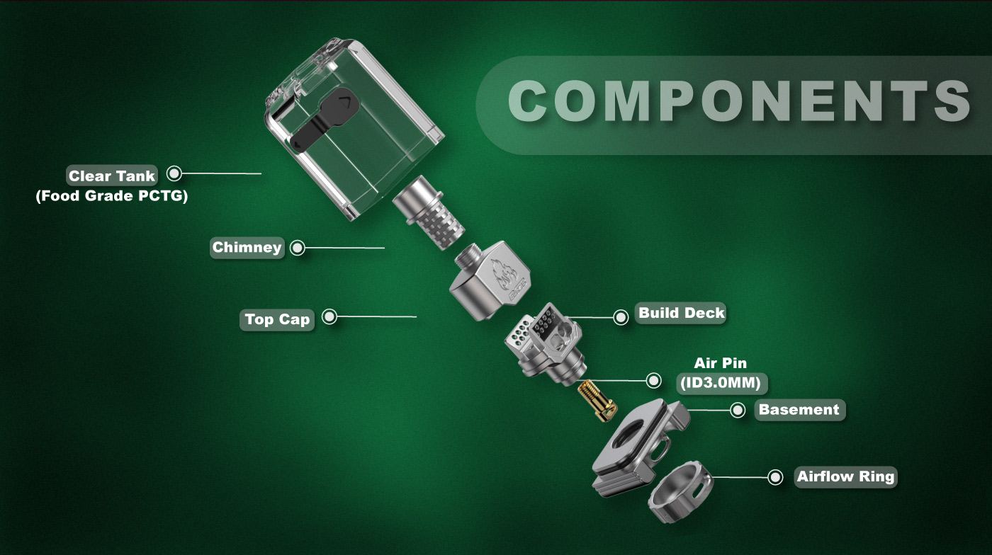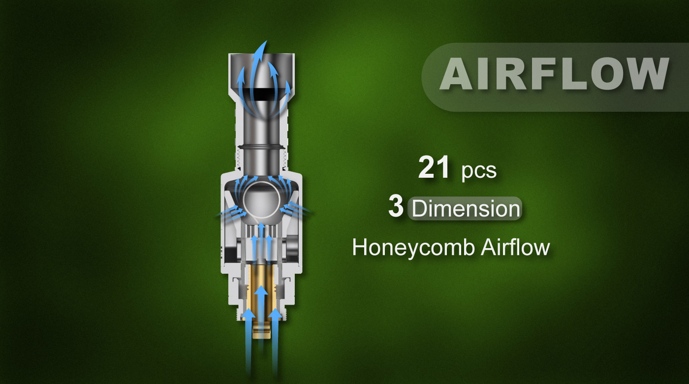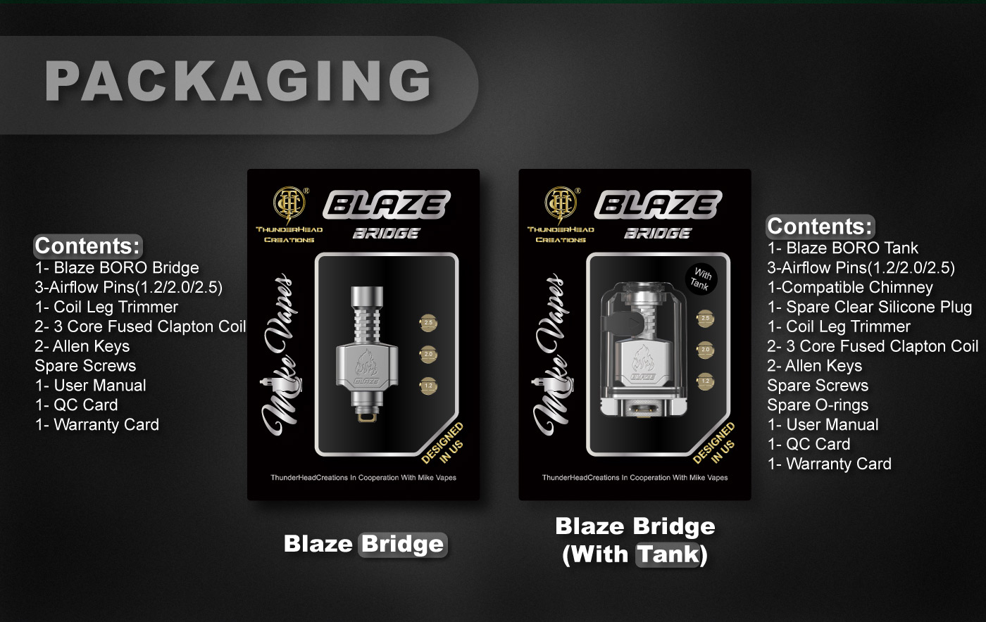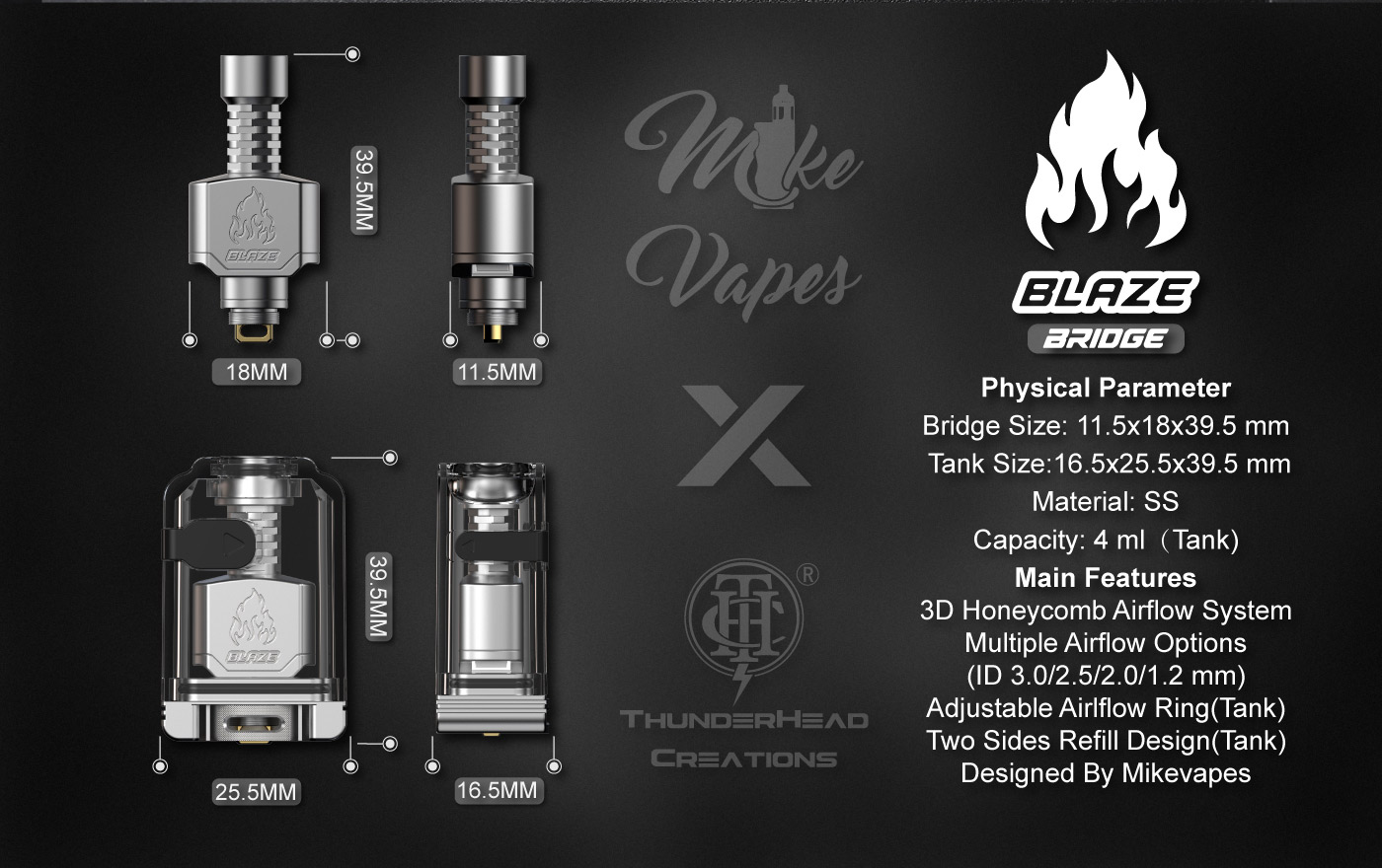 Thunderhead Creations hat zusammen mit dem YouTuber Mike Vapes einen Tank für Boro Mods entwickelt, den THC Blaze Boro Tank. Der Blaze Boro Tank richtet sich ganz klar eher an Fans des offenen Zugwiderstandes. Dem Tank Kit liegt zwar ein 1,2mm Pin bei und an der Base liesse sich der Airflow auch stufenlos einstellen, das Deck der RBA ist jedoch eher für grosse Coils (mit 3,0mm Innendurchmesser) gemacht und eignet sich weniger für kleine Coils (benötigt eine grosszügige Menge an Watte, sonst kann es zur Flutung des Decks kommen). Der Thunderhead Creations Blaze Boro Tank besteht aus der Blaze RBA und dem Tank. Die Blaze RBA besitzt ein Deck im postless Style, wobei die Coil gleich von 3 Seiten her mit Luft angeströmt wird. Seitlich wurde die Luftzufuhr im Honeycomb Design gehalten, während die Luft von unten her durch drei grosse Öffnungen an die Coil gelangt.