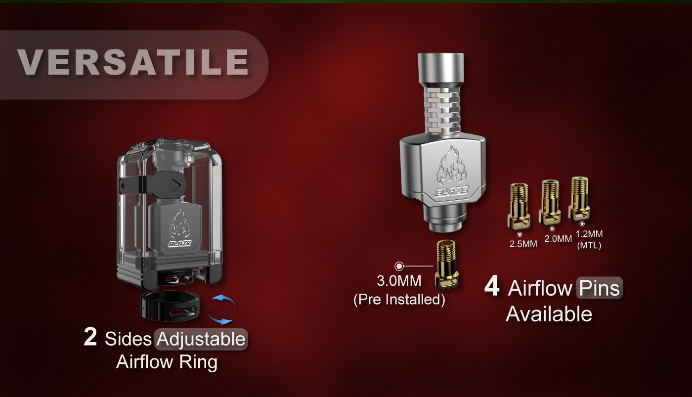Zum anbringen und ausglühen der Coil benötigt man beim Blaze Boro Tank keinen Adapter, an der RBA selbst befindet sich ein 510 Gewinde. Der Tank des THC Blaze Boro Tanks fasst 4ml Liquid und lässt sich von zwei Seiten her befüllen (Front und Seite). Somit lässt sich der Tank bei den meisten Boro Mods im eingebauten Zustand befüllen. An der Unterseite der Base befindet sich die Airflow Control, über welche man den Zugwiderstand noch feiner abstimmen kann. Nutzt man die RBA jedoch in einem regulären Boro Tank, dann muss man auf die Airflow Control vom Tank verzichten und kann den Zugwiderstand nur über die 4 Pins realisieren.