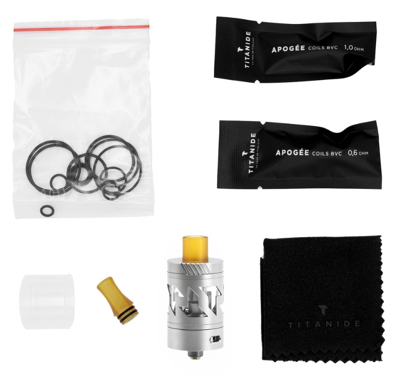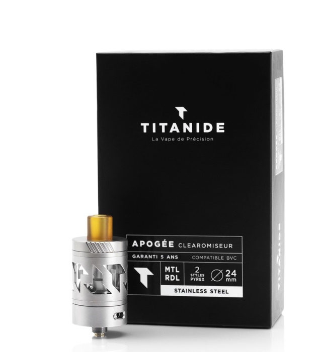 Der Titanide Apogée 24mm MTL Tank ist ein Fertigcoiltank des französischen Herstellers Titanide. Der Apogée MTL Tank hat einen Durchmesser von 24mm und besitzt je nach verwendetem Tankglas 3,6ml (mit Tankshield) bzw. 4,5ml (Pyrex) Tankvolumen. Zum Einsatz kommen die neuen BVC Coils von Titanide mit einer Kanthalwicklung, welche mit den Widerständen 0,6 Ohm und 1 Ohm verfügbar sind. Man kann jedoch auch auf die Aspire BVC Coils des Nautilus oder die Vaptio C Coils ausweichen, da diese ebenfalls kompatibel sind. Der Titanide Apogée 24mm MTL Tank besitzt ein Top Filling mit Bajonettverschluss, dadurch ist der Verdampfer bequem und einfach wieder befüllbar.