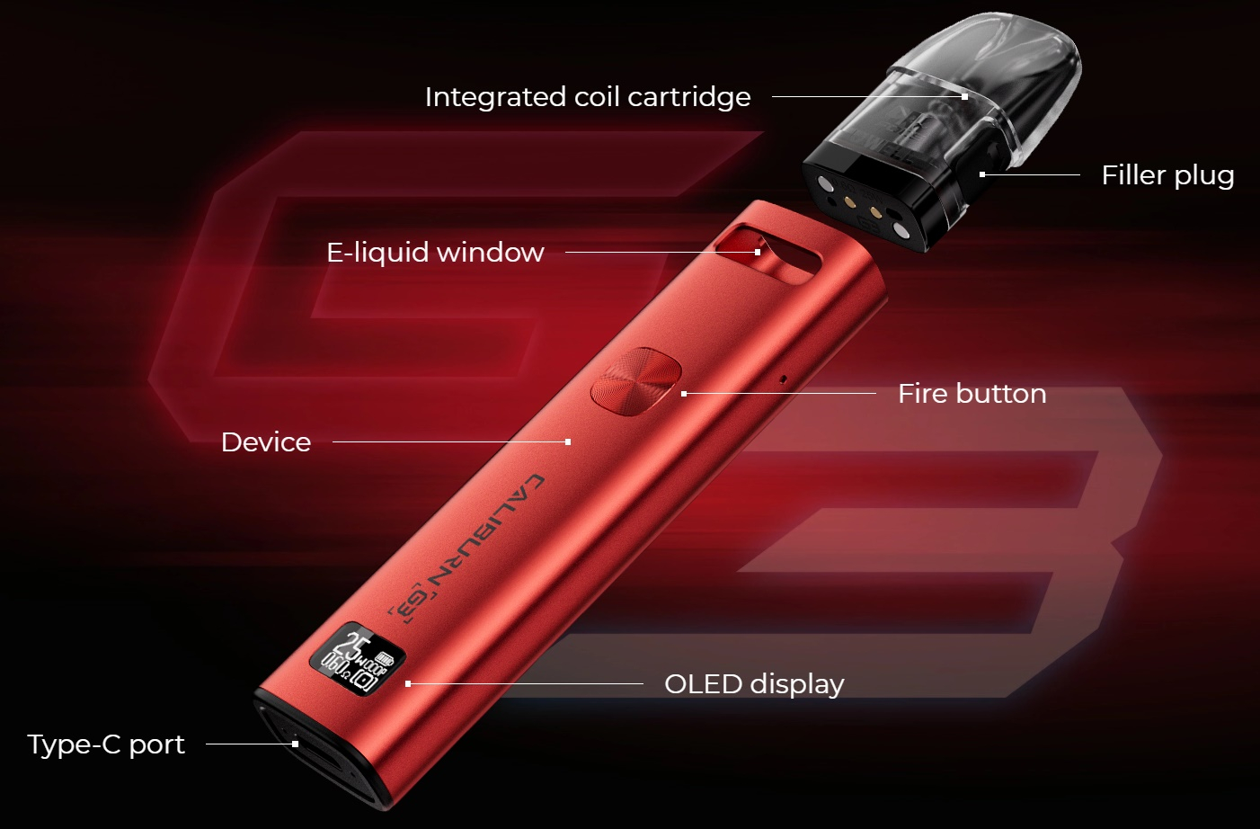 An der Frontseite befindet sich das OLED Display, welches den Nutzer über die festgelegte Leistung, die Anzahl Züge und den Akkustand informiert. Im Gegensatz zu den alten Caliburn G und G2 lässt sich die Leistungsabgabe beim Caliburn G3 einstellen. Dies ist jedoch nicht zwingend nötig, da die Leistung beim einstecken des Pods gleich auf den optimalen Wert eingestellt wird. Eine Neuerung ist auch die dreifache Sperrfunktion. Wie schon beim Caliburn X lässt sich auch beim Caliburn G3 der Feuertaster sperren und dann nur die Zugautomatik nutzen. Man kann aber auch die Zugautomatik sperren und den Feuertaster nutzen oder auch beide Funktionen entsperren. Dies erreicht man durch zweimaliges drücken des Feuertasters. Drückt man den Taster 3x, lässt sich die Leistung entsprechend des eingesetzten Pods einstellen.