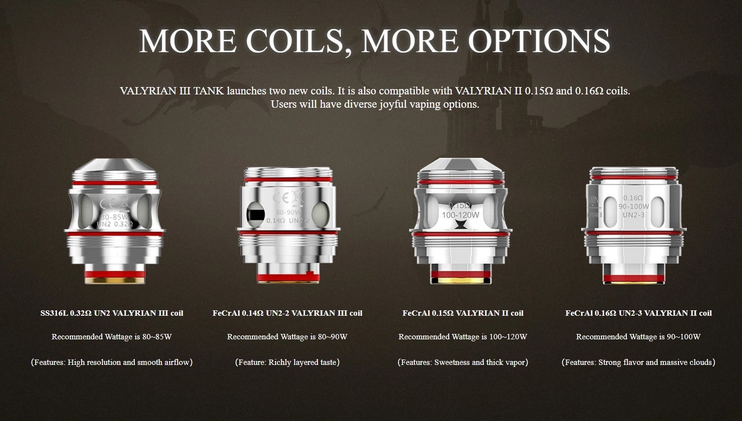 Im Innern kommen zwei neue Coils zum Einsatz: der SS316L 0,32 Ohm UN2 und der FeCrAl 0,14 Ohm UN2-2. Beide passen ebenfalls in den Valyrian 2, wie auch der 0,15 Ohm und der 0,16 Ohm vom Valyrian 2 im Valyrian 3 genutzt werden können. Im Vergleich zum Vorgänger wurde auch das Selbstreinigungssystem verbessert, welches auslaufendes Liquid verhindern soll. Dieses System hat sich schon in den neueren Crown Verdampfern bewährt.