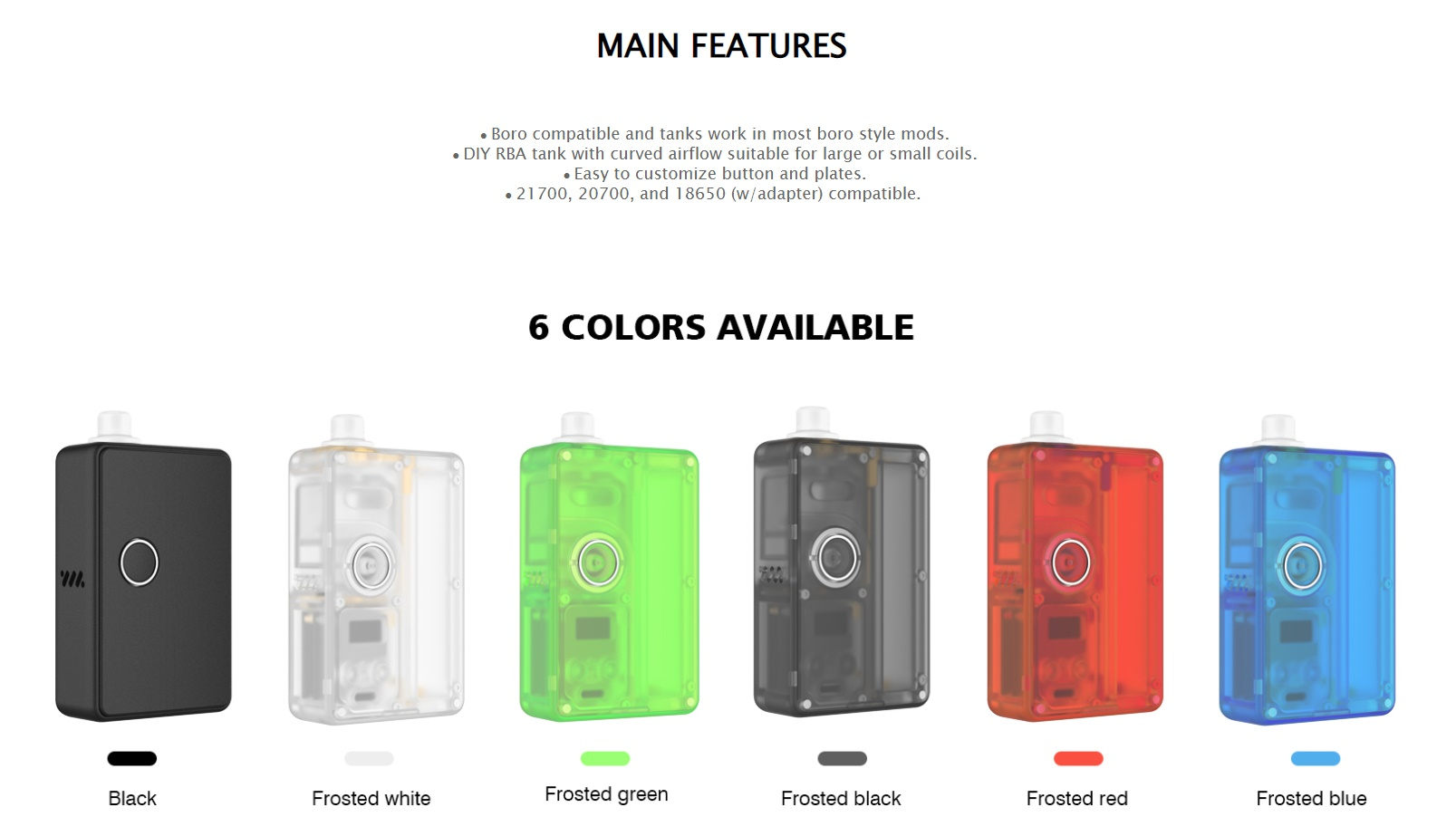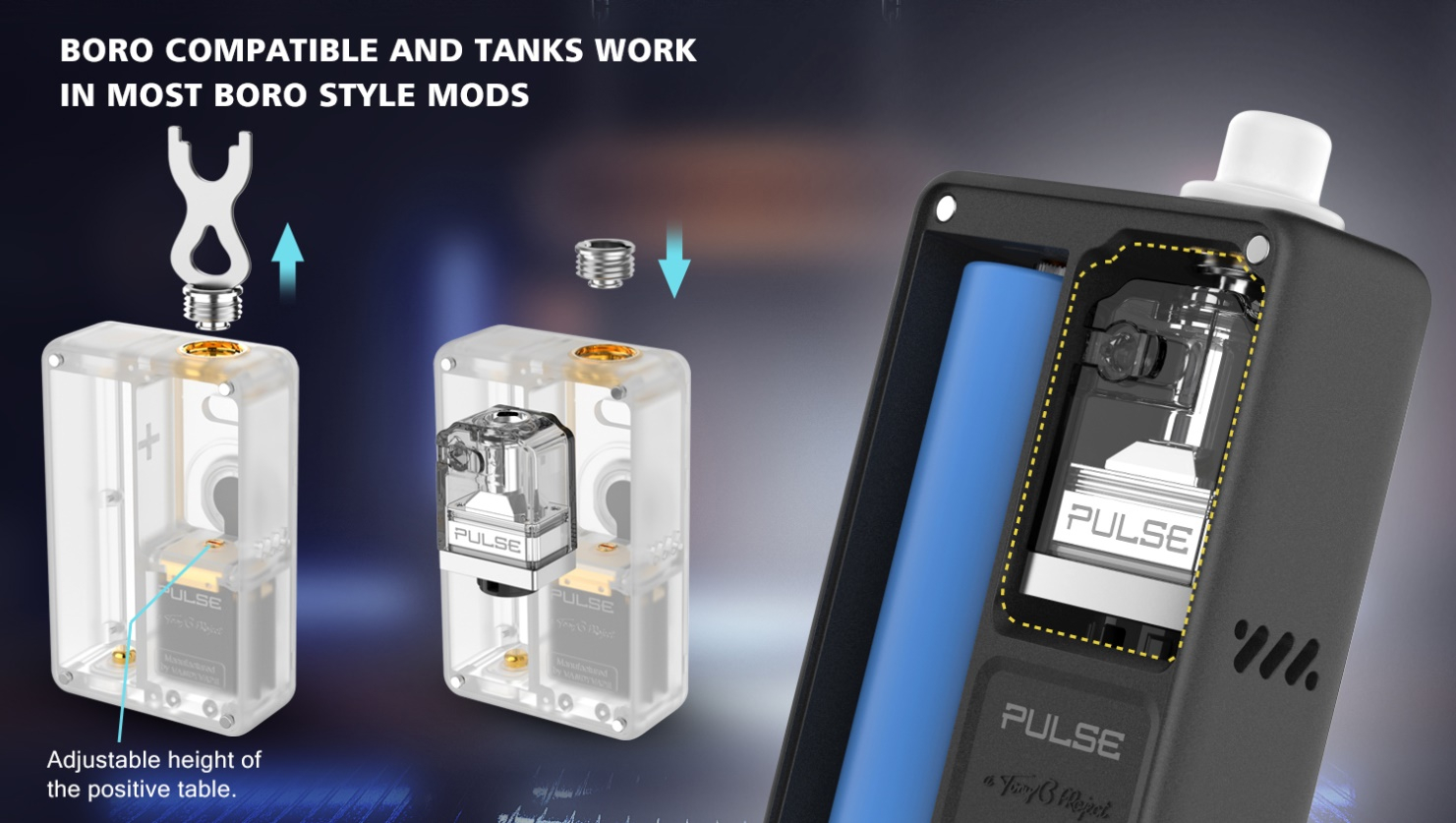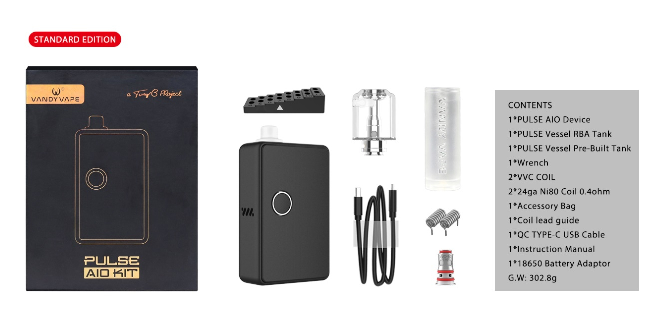 Vandy Vape hat mit der Pulse AIO ein boro-kompatibles All-In-One Gerät auf den Markt gebracht, welches die Gene vorheriger Pulse Modelle in sich trägt. Die Idee zur Pulse AIO stammt wieder mal vom bekannten YouTube Reviewer Tony B (Vapor Trail Channel), dessen Ziel ein erschwingliches Gerät mit hoher Kompatibilität zu bestehenden Boro RBAs war. Ausgelegt ist die Vandy Vape Pulse AIO für die Nutzung mit einem 21700 Akku (nicht inbegriffen), man kann aber dank des beiliegenden Adapters auch einen 18650 nutzen. Damit lassen sich im Watt Modus bis zu 80W abrufen. Geliefert wird das Kit mit jeweils 2 Tanks: dem Vessel Fertigcoil Tank und der Vessel RBA. Während der Tank der RBA 3,7ml Füllvolumen hat, sind es beim Fertigcoil Tank 5ml. Beide Tanks lassen sich dank des seitlichen Füllloches  einfach befüllen.