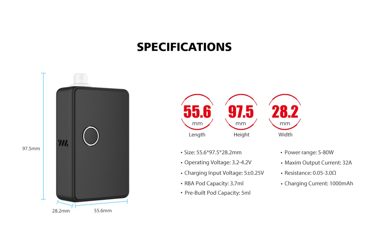 • Tank Füllvolumen: 3,7ml (RBA) / 5ml (Fertigcoils)