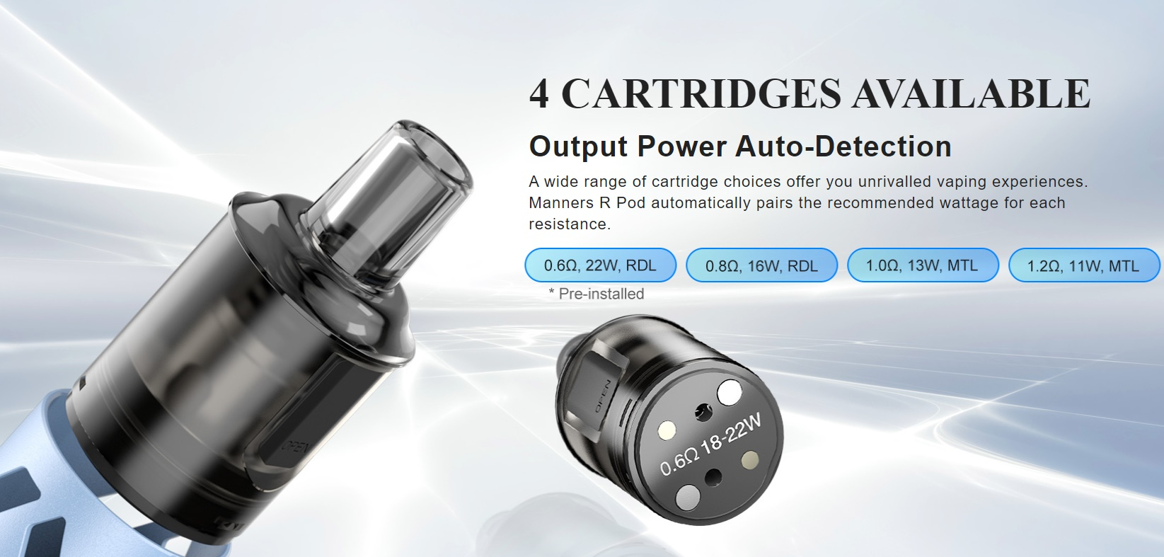 Vapefly bietet für den Manners R Pods mit 4 verschiedenen Widerständen an: 0,6 Ohm, 0,8 Ohm, 1,0 Ohm und 1,2 Ohm. Dadurch lässt sich der Pod Mod ganz der eigenen Dampfvorliebe nach anpassen. Der Vapefly Manners R verfügt über einen Feuertaster und eine Zugautomatik, wobei sich der Feuertaster auch sperren lässt und dann nur die Zugautomatik aktiv ist. An der Seite des Gerätes befindet sich ein Slider zum einstellen des Zugwiderstandes.