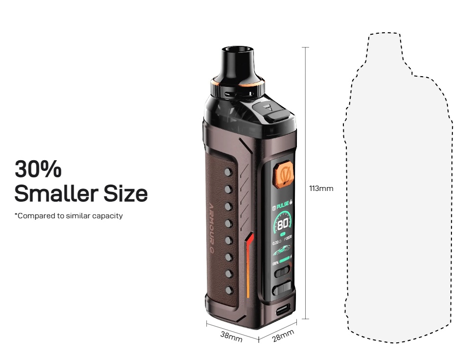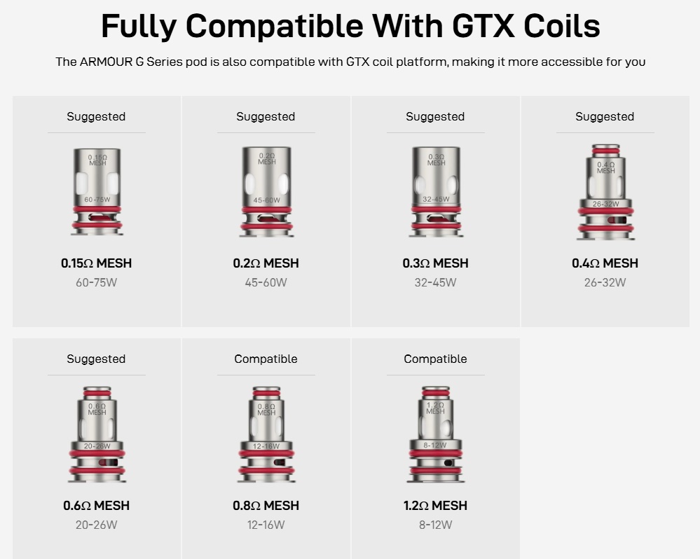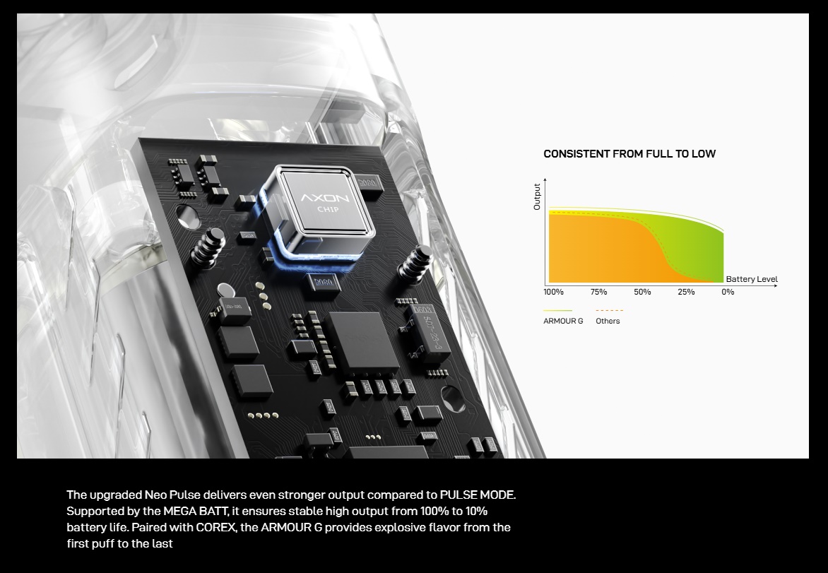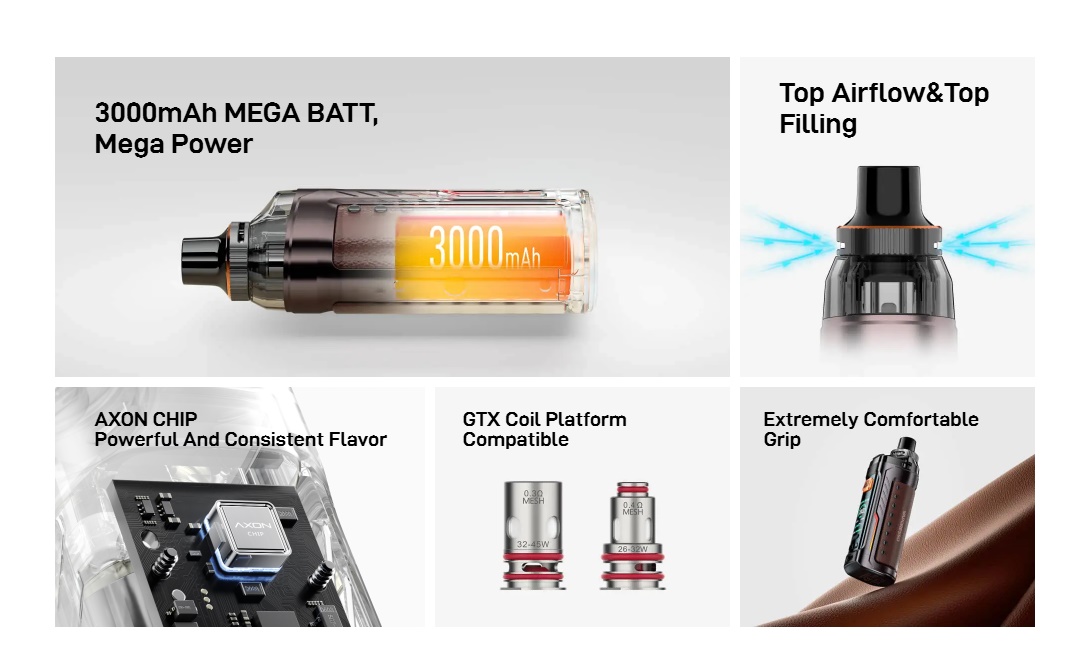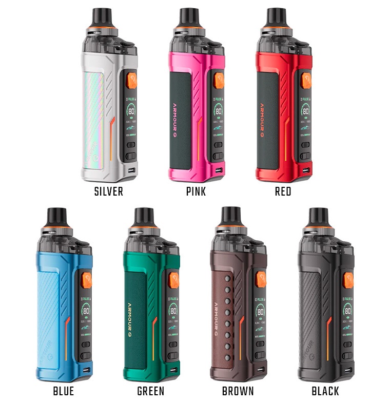 Als Coils kommen die bekannten GTX Coils zum Einsatz, welche ein breites Spektrum von 0,15 Ohm bis 1,2 Ohm abdecken. Der im Vaporesso Armour G verbaute Axon Chip bietet eine Leistung von max. 80W und ermöglicht dank der verschiedenen Betriebsmodi eine individuelle Anpassung an den eigenen Geschmack. Dank des ergonomischen Designs und der kompakten Bauform liegt der Armour G sehr angenehm in der Hand.